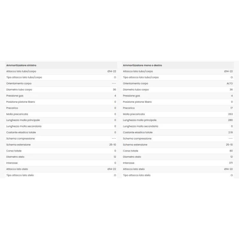 CARATTERISTICHE TECNICHE Ammortizzatori monocamera pressurizzati a gas (Azoto), con pistone flottante separatore olio/gas. Corpo ammortizzatore in acciaio legato ad alta resistenza, testine in lega di alluminio ricavate dal pieno con lavorazione CNC.