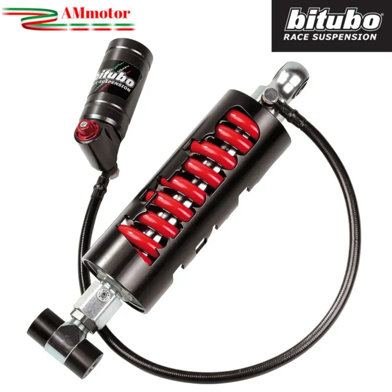 Ammortizzatore monocamera, corpo ammortizzatore in acciaio, stelo in acciaio Ø14mm; pressurizzato a gas tramite camera di compensazione separata collegata con tubo flessibile per altissime pressioni; molla a rigidità lineare; campana esterna realizzata con struttura a gabbia.