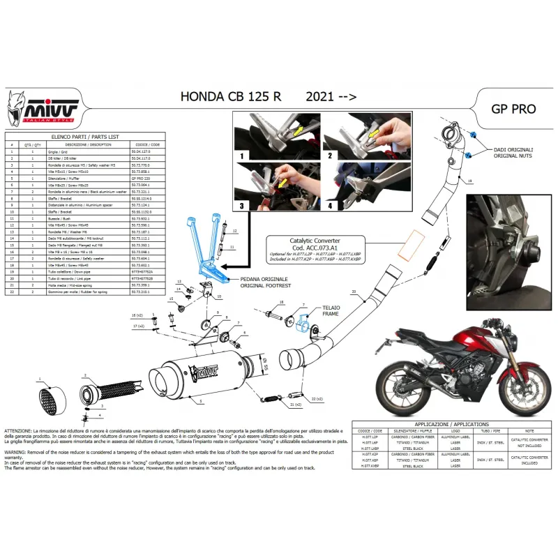 GP PRO mostra una saldatura a TIG semiartigianale, un design compatto ed essenziale e un sound aggressivo. Ispirato al mondo delle competizioni, il tubo in uscita dello scarico è dotato di una grata di protezione removibile che nasconde il dB-killer. Sul terminale è presente il caratteristico logo Mivv realizzato tramite laser.