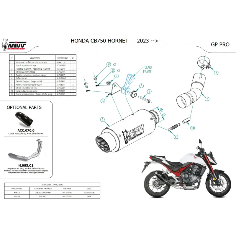 GP PRO mostra una saldatura a TIG semiartigianale, un design compatto ed essenziale e un sound aggressivo. Ispirato al mondo delle competizioni, il tubo in uscita dello scarico è dotato di una grata di protezione removibile che nasconde il dB-killer. Sul terminale è presente il caratteristico logo Mivv realizzato tramite laser.