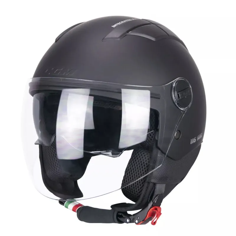 Il casco 4 stagioni, è ideale per affrontare le stagioni più calde grazie alle grandi feritoie in calotta che garantiscono il riciclo d'aria all'interno del casco e allo stesso tempo valido anche in condizioni avverse grazie alla visiera esterna lunga e alle apposite cover per le feritoie fornite in dotazione. Il 116 AIR è realizzato in due misure di calotta esterna in HPT (High Performance Terpolymer) e con quattro calotte interne in EPS multidensità. Dispone inoltre di visiera interna parasole a scomparsa, interni termoformati, guanciali e sottomento realizzati con tessuto antiallergico e antibatterico facilmente removibili e lavabili. Completano le dotazioni la fibbia micrometrica, l'anello antifurto al cinturino e l'elastico fermacinturino.