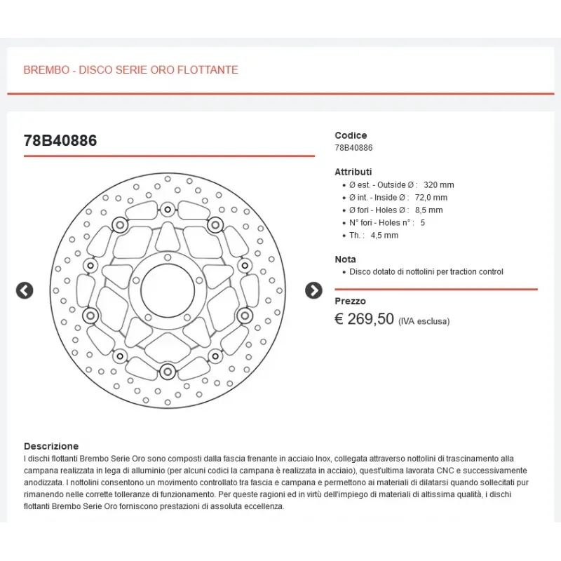 Brembo, azienda leader nel campo degli impianti frenanti, offre con i Serie Oro una linea completa di dischi in grado di soddisfare qualsiasi necessità: perfettamente intercambiabili ai dischi di serie, sono la scelta dei motociclisti che non vogliono rinunciare alla qualità Brembo.