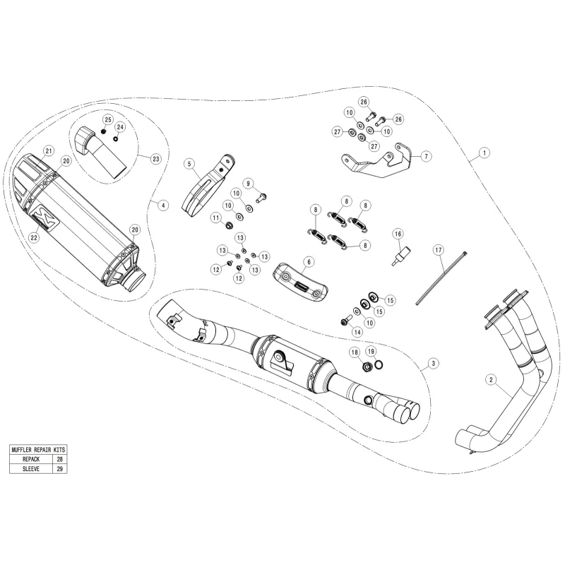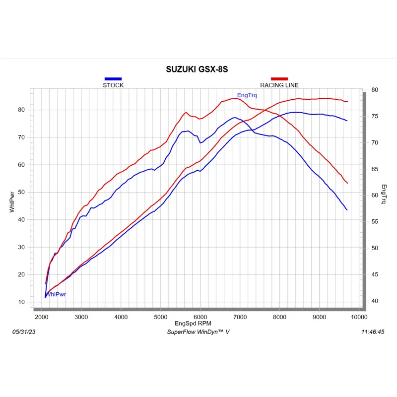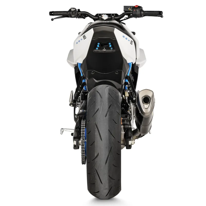 Si tratta di uno scarico completamente nuovo, progettato da zero e costruito con materiali leggeri e collaudati per le gare. Il manicotto esterno, il paracalore e la fascetta del silenziatore in fibra di carbonio, il fondello in titanio, il collettore, il risuonatore e il tubo di collegamento in acciaio inossidabile e la staffa del silenziatore in alluminio rivestito di nero consentono di ridurre il peso del 39,6% (3,2 kg) rispetto allo scarico di serie. Il percorso alternato dello scarico lo colloca sul lato destro della moto (la versione standard passa sotto la moto), con un conseguente stile più racing, mentre il paracalore in fibra di carbonio offre protezione dal calore e un tocco finale accattivante. Offre un aumento di potenza e di coppia rispettivamente di 4,7 kW (6,4 CV) a 9.200 giri/min e di 4,7 Nm a 7.650 giri/min, quando è stato testato sul banco di prova di Akrapovič e confrontato con una Suzuki GSX-8S dotata dell'impianto di serie.