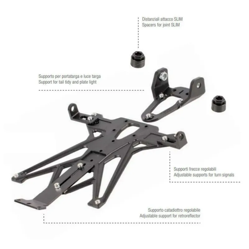 I portatarga Lightech sono costruiti in due semplici parti tagliate, piegate e forate con macchine a controllo numerico in modo da garantire la precisione nel montaggio. Si installa utilizzando i fori e gli alloggiamenti preesistenti sulla moto. Per fissarlo si utilizza la bulloneria di serie della moto.