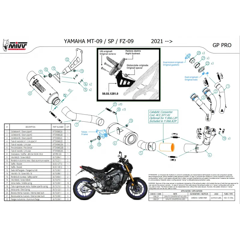 GP PRO mostra una saldatura a TIG semiartigianale, un design compatto ed essenziale e un sound aggressivo. Ispirato al mondo delle competizioni, il tubo in uscita dello scarico è dotato di una grata di protezione removibile che nasconde il dB-killer. Sul terminale è presente il caratteristico logo Mivv realizzato tramite laser.
