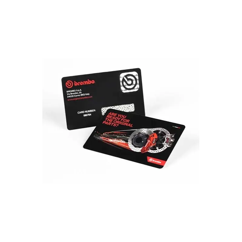 La carta, all'interno di un astuccio sigillato, contiene un codice segreto composto da 6 cifre che inserito sul sito DELLA BREMBO consente di verificare con assoluta certezza la genuinità del prodotto acquistato.
