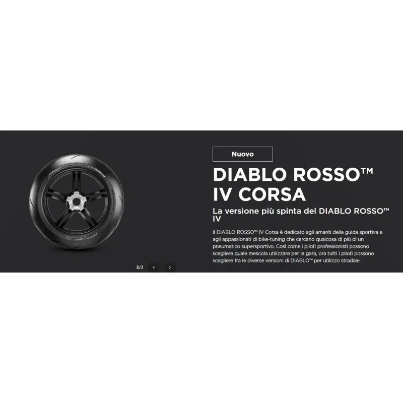 Il DIABLO ROSSO™ IV Corsa è dedicato agli amanti della guida sportiva e agli appassionati di bike-tuning che cercano qualcosa di più di un pneumatico supersportivo. Così come i piloti professionisti possono scegliere quale mescola utilizzare per la gara, ora tutti i piloti possono scegliere fra le diverse versioni di DIABLO™ per utilizzo stradale.