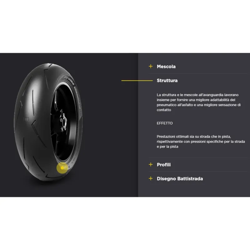 I materiali strutturali sono condivisi con DIABLO SUPERBIKE, l'asseblamento di DIABLO SUPERCORSA V4 SP è messo a punto per fornire un comportamento ottimale del pneumatico sia su strada che in pista.