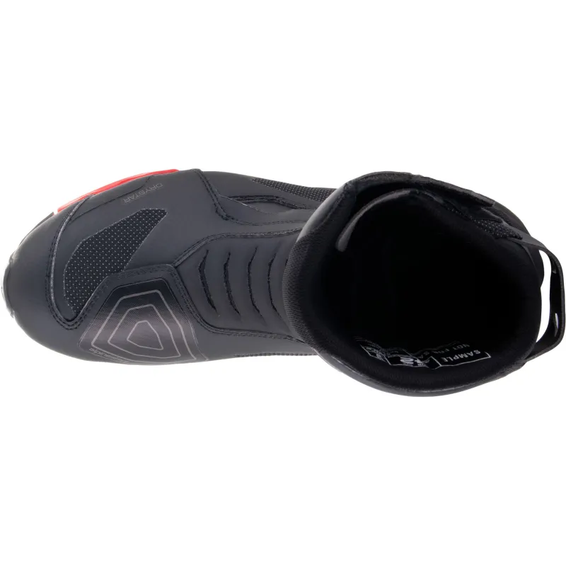 Sistema di ingresso laterale con cerniera montata su elastico e un'ampia linguetta con chiusura a strappo per praticità e una calzata precisa e sicura.