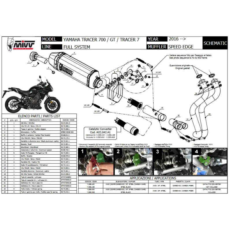 Realizzato con corpo in acciaio inox spazzolato e con coppa e fascetta di ancoraggio in carbonio, lo scarico è di forma esagonale ed è dotato di dB-killer estraibile.