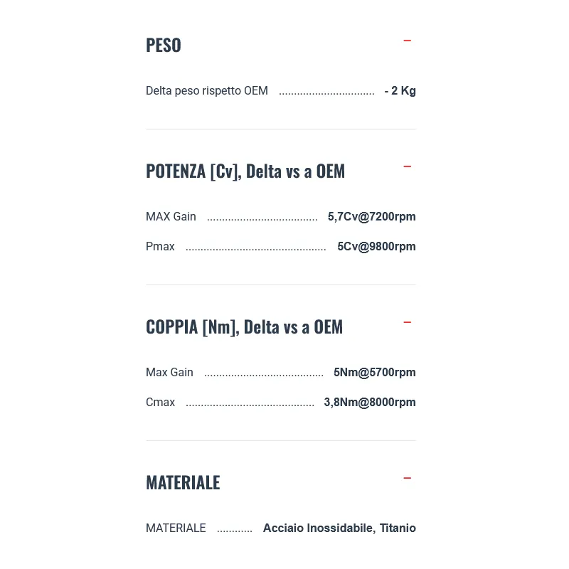 Installando il gruppo completo di scarico si ottiene un miglioramento su tutto l’arco di utilizzo del motore cosi da migliorare ulteriormente le performance della moto, come accelerazione e peso.